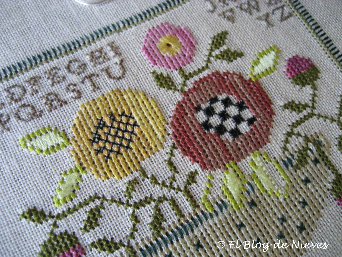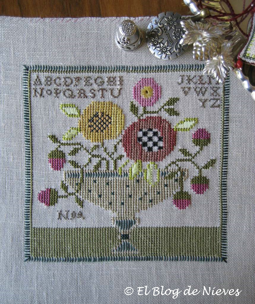 El abecedario está hecho a un punto y la composición me parece muy lograda, los florones, las hojas bordadas, el jarrón... todo formando un conjunto muy equilibrado.