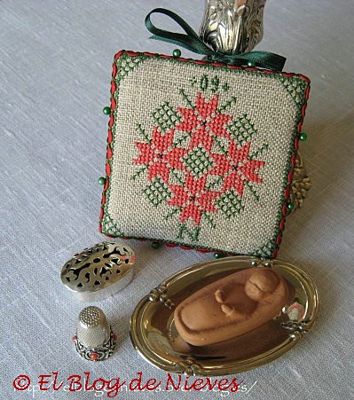 El motivo clásico de ponsettias esta bordado sobre lino rústico. Y todo el piquillo rojo del contorno cosido con seda verde haciendo un zigzag. La tela de algodón en verdes y rojos es muy alegre.