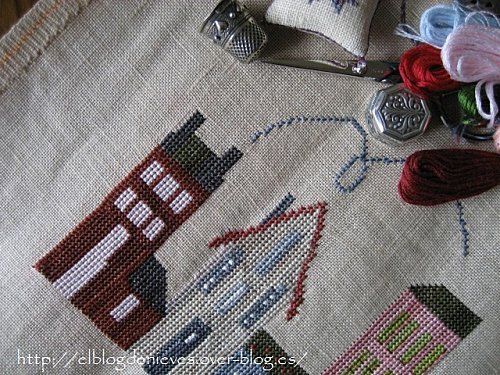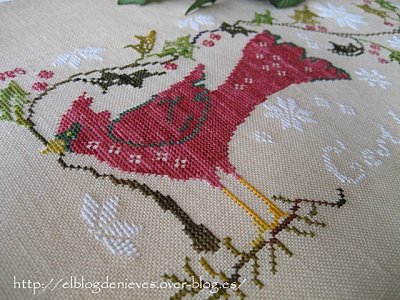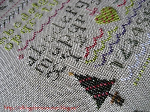 Sacados los motivos de la revista De fil en Aiguille este sampler me resulta gracioso y ligero y los charms navideños le dan un toque moderno y original.