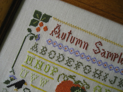 Pequeño sampler en verde y toques naranjas que queda muy coqueto en un rincón de mi cocina.