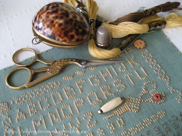 Un diseño francés sencillo y original, la tijera, el dedal, la bobina, un botón de corazón y unos charms para dar un toque personal....