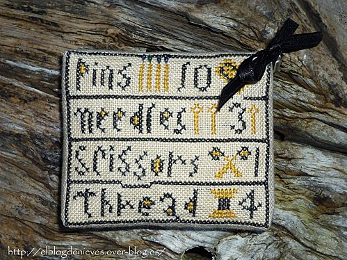 Están bordadas en negro y amarillo, me encanta la pequeña, la he acabado estilo tableta con fuelle alrededor y un lazo en una esquina. La rectangular con un simple punto a festón, me parecen muy saladas sus letras irregulares.