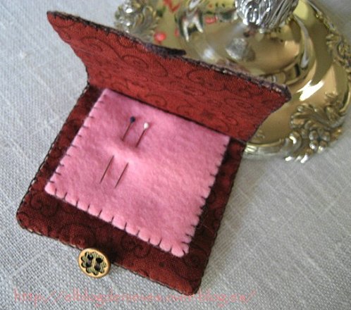En este caso es un librito para agujas con el clásico motivo de ponsettia quaker en colores rosas y berenjenas y una estrella al dorso. El interior es de una tela granate estampada y el fieltro de pinchar en tono rosa.