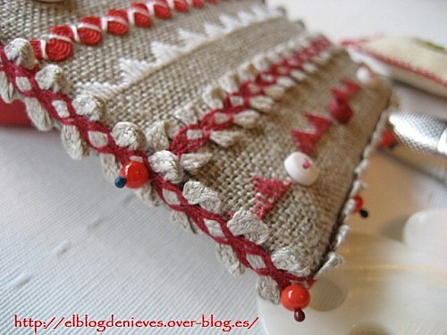 Hola Nieves. precioso y original. Esa tela rústica, y la combinación de tonos rojos, es fantástica. Un abrazo, Laura.