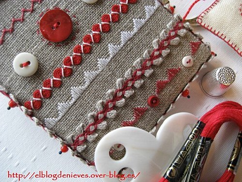 Este pinkeep no tiene nada de punto de cruz, es un muestrario de cintas y botones con un poco de bordado e imaginación.