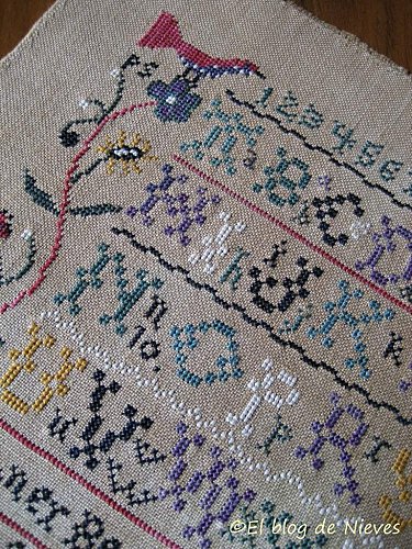 ...Reza la leyenda del Sally Spencer Sampler de los diseños Bird of a Feather. Es un sampler que me enseñó mi amiga Eva y me encantó, me ha costado hacerlo pues el lino es teñido a mano en color garbanzo envejecido (realmente no se aprecia lo bonito que es) y el tejido está muy cerrado y cuesta más la puntada pero el resultado me encanta.