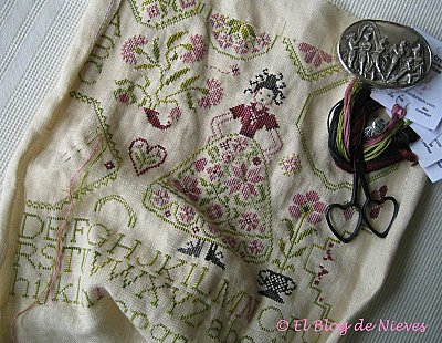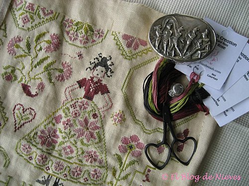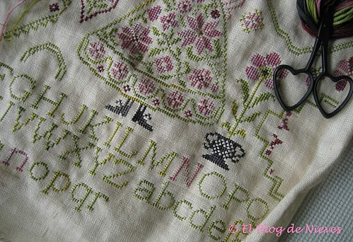 Lo estoy bordando en tonos rosas, granates y verdes con algún toque de gris antracita... es minucioso de hacer pero el resultado merece la pena.