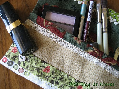 Para "estirar" un poco los que tengo de mis telas, en vez de utilizar únicamente el borde he mezclado pedazos más anchos y me ha salido una bolsa para las cosas de maquillaje que es un mix entre Patchwork y Selvage, con un toque de encaje.