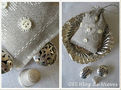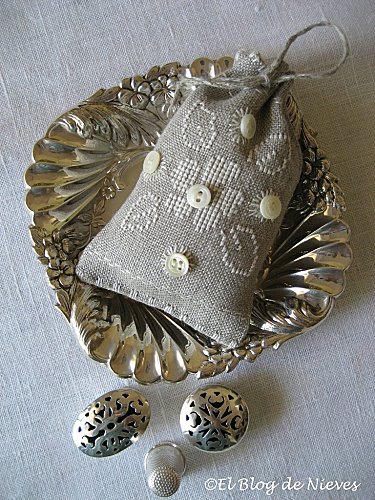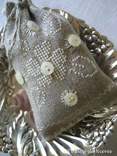 Un ejemplo es esta bolsita de lino crudo bordada en blanco y con botones aplicados, que está rellena de lavanda para perfumar cajones. Es de la revista Jane Greenoff's CrossStitch.
