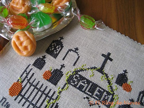 Para finalizar la serie de motivos de Halloween he elegido este sampler que nos muestra un cementerio rodeado de una verja negra con el nombre de la ciudad de Salem.... Entre las tumbas y puertas hay calabazas por todos lados y no puede faltar el gato negro. Es un diseño estilo primitivo realmente espeluznaaaante!!!
