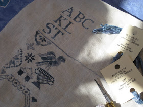 Es la labor que me traigo entre manos, toda en gama de azules con madejas de hilo teñido.