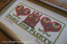 Peace and Plenty sampler de Cross Country Stitching con motivos de corazones y una casa todo bordado en colores rojos y verdes muy Folk.