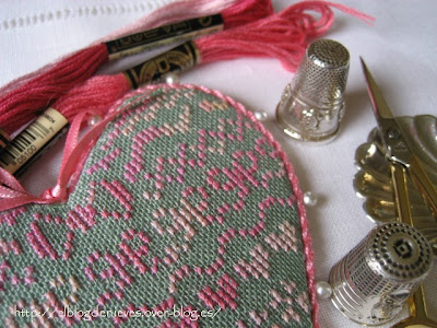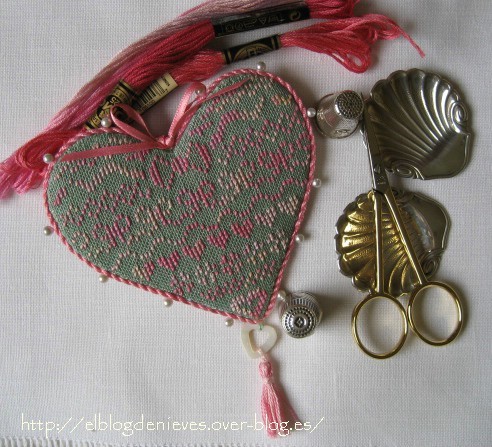 El cordón hecho a mano y la borla colgada del corazón de nácar le dan un toque más barroco que creo queda muy bonito.