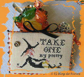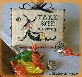 Son clásicos los disfraces, las calabazas y los caramelos... Para ir preparándonos ¿que os parece mi bruja con pretensiones de mujer fatal, incluido el encaje? Es un divertido diseño de Plum Street Samplers llamado My Pretties.