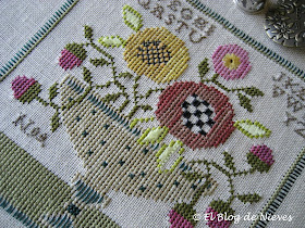 El abecedario está hecho a un punto y la composición me parece muy lograda, los florones, las hojas bordadas, el jarrón... todo formando un conjunto muy equilibrado.