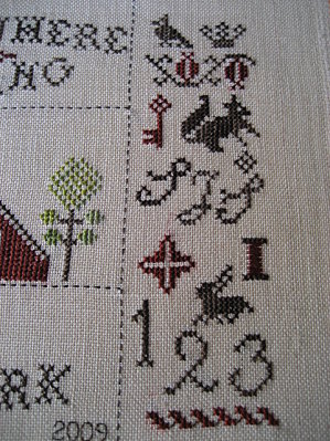 Home is Where You Hang Your Needlework de Homespun Elegance es un sampler de estilo bastante clásico pero con toques muy originales como por ejemplo todo el pespunte que encuadra las secciones del bordado.