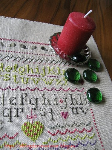 Sacados los motivos de la revista De fil en Aiguille este sampler me resulta gracioso y ligero y los charms navideños le dan un toque moderno y original.