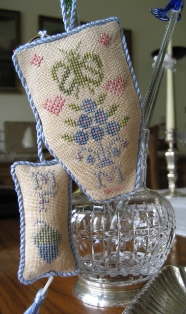 El cordón azul lateral lo he hecho con tres hebras de perlé fino y he utilizado un corazón de nácar para unir la borla al fob.