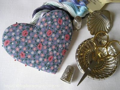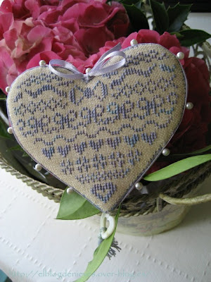 Este en forma de corazón, con tonos azules lavanda que tanto me gustan de madejas teñidas a mano. Los motivos del bordado son corazones (¡como no!) y lazos. Más adelante os enseñaré otro que hice en colores rosas....