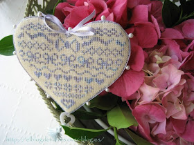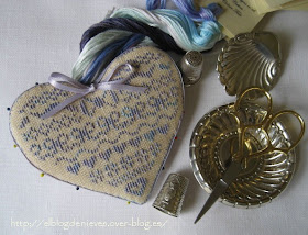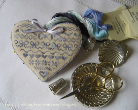 Este en forma de corazón, con tonos azules lavanda que tanto me gustan de madejas teñidas a mano. Los motivos del bordado son corazones (¡como no!) y lazos. Más adelante os enseñaré otro que hice en colores rosas....