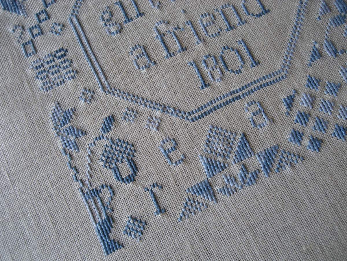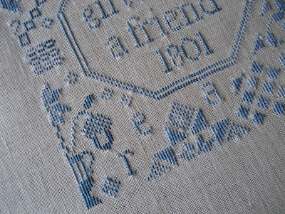 Quaker Friendship Sampler de la casa The Goode Huswife es una pequeña joya, el original está hecho en color negro pero lo he preferido hacer en azules, para mi yerno.