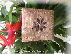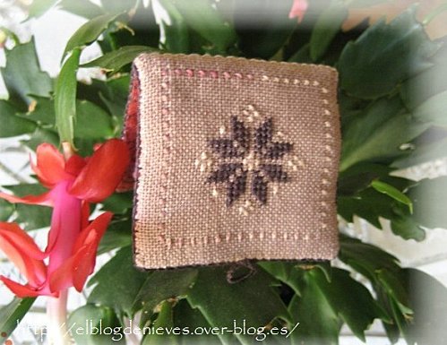En este caso es un librito para agujas con el clásico motivo de ponsettia quaker en colores rosas y berenjenas y una estrella al dorso. El interior es de una tela granate estampada y el fieltro de pinchar en tono rosa.