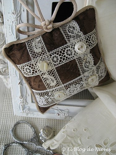 Una pequeña almohadilla de adorno, de esas que se hacen con ideas de aquí y de allá. Encajes antiguos que compré en un precioso pueblo de la costa francesa llamado Villefranche-sur-Mer, botones de nácar rescatados de prendas de las canastillas de mis hijos.