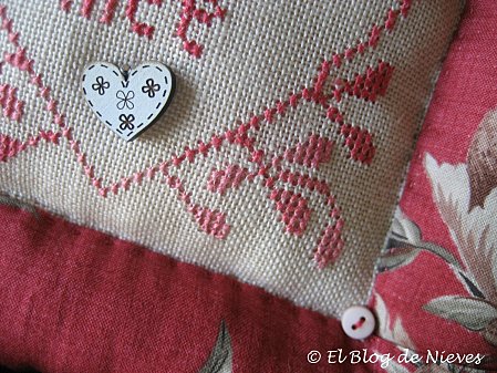 Como pequeños adornos he utilizado botones en las esquinas de la almohadilla y un corazón decorativo que le da mucha alegría....