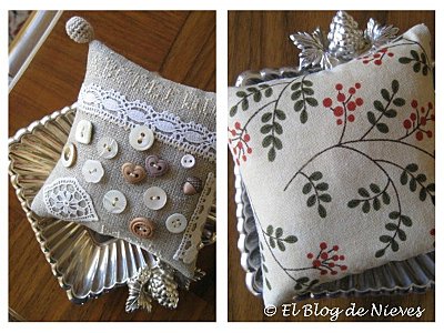 Antes de volver de Madrid, le dejé hecho a mi hija este acerico con botones y trocitos de encajes.