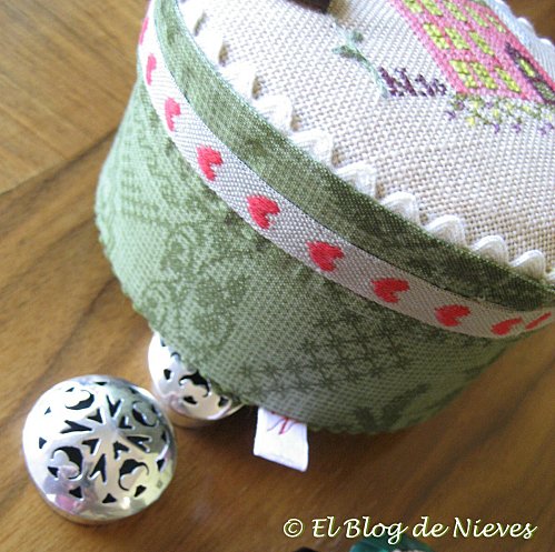 La he adornado con piquillo beige, cinta de algodón de corazones, un botón muy gracioso también en forma de corazón y la tela de la caja la compré en Dechado y recrea ,en tonos verdes, motivos de punto de cruz.