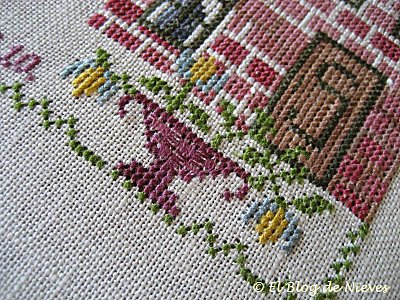 Valentine Rose de Blackbird Designs es un sampler muy lucido, con la casa de ladrillo deslavado y los pajaros amorosos....